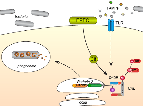 Cif’s are bacterial effector proteins that are injected into the cytosol of host cells by bacterial Type III protein secretion systems. Once inside a host cell Cif’s inactivate CRLs by enzymatic modification, specifically deamidation, of NEDD8. Thus, Cif’s block all CRL-dependent ubiquitylation within host cells. As expected, we have shown that ubiquitylation of Perforin-2 and Perforin-2 -dependent killing is blocked by bacteria that express Cif but not mutants in which cif has been deleted. We have also shown that Cif+ pathogens are more virulent in vivo than cif mutants (McCormack et al. eLife 2015, Figure 8). Crucially, Cif does not confer a selective advantage in Perforin-2 knockout animals (McCormack et al. eLife 2015, Figure 9). In other words, when Perforin-2 –the crucial target/substrate molecule– is absent, the pathogenic benefits of Cif are nullified. Thus, host cells ubiquitylate and deploy Perforin-2 to defend themselves against microbes. As a countermeasure some pathogens deploy Cif’s to block the intracellular trafficking of Perforin-2 to endo-phagosomes.